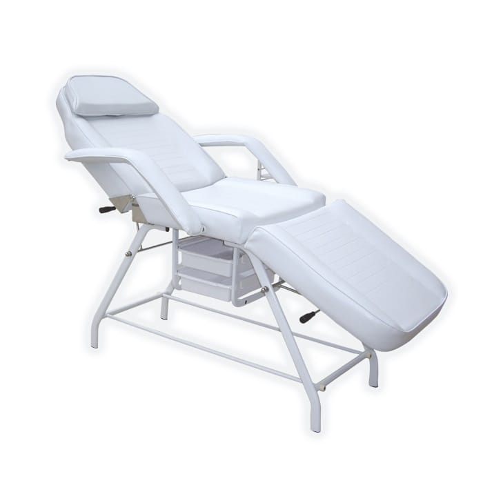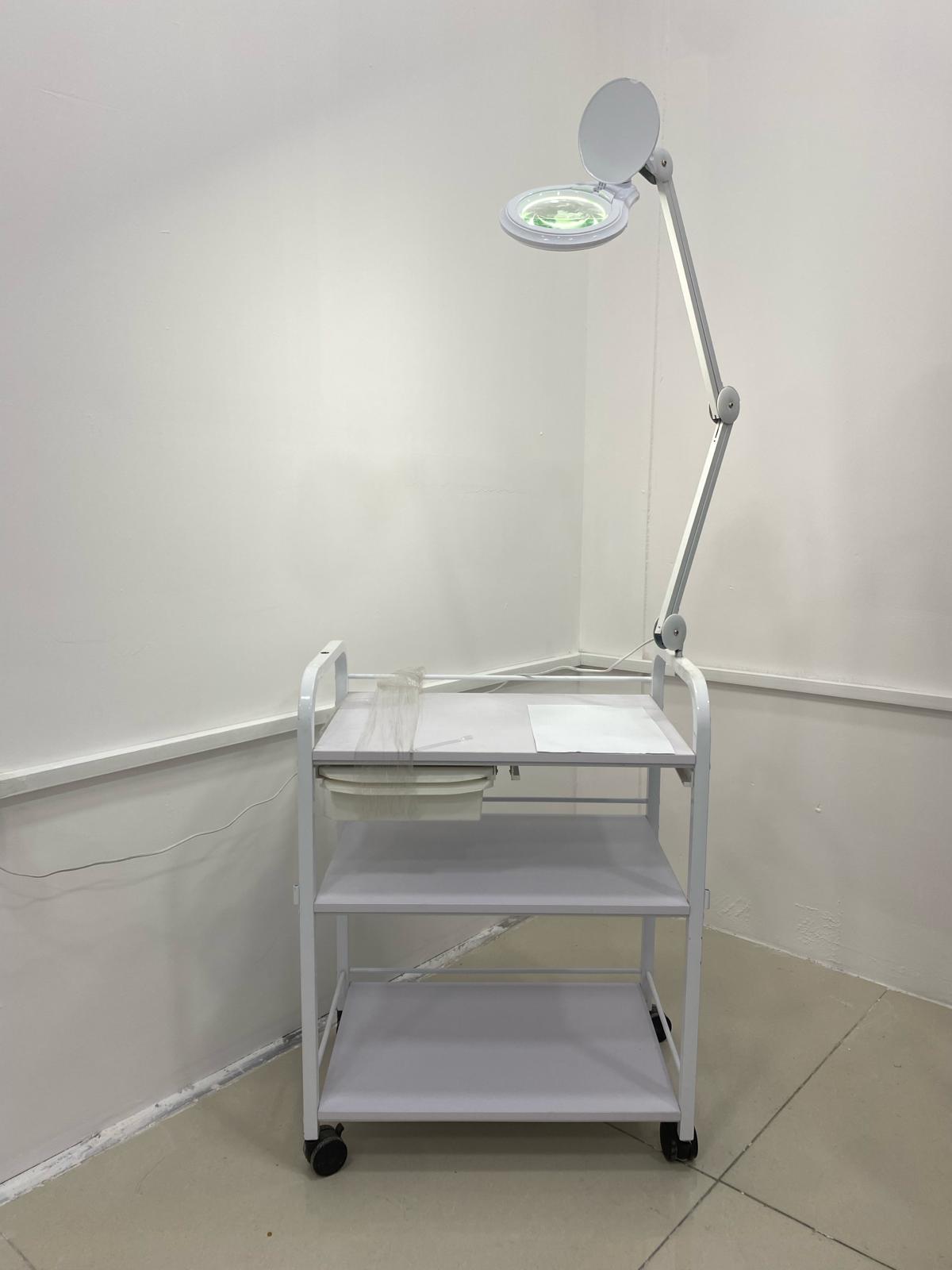 מיטת טיפולים, עגלה עם 3 מדפים, לופה 5 אינץ', כיסא מקצועי ללא משענת